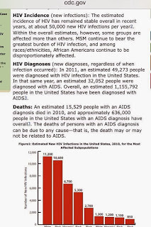 I utterly dislike people who spread ignorance with authority. The fact of the matter, every 10 minutes a person becomes infected with HIV in the United States. The fact is, CDC estimates 47, 500 new cases of HIV in the United Sates in 2010. The fact is, each person living with HIV has their own health struggle with this disease. While there are similarities there are also extreme differences. For example, some people take one pill a day, others like me, take 15 pills a day. The fact is, 15, 500 people died in the United States from AIDS in 2010 and CDC estimates 635,000 has died since the beginning of the pandemic. Worldwide there were 2.5 million new cases of HIV in 2011 with about 17 million deaths in 2011 and an estimated 34 million living world wide.