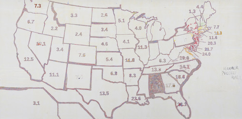 “Finding Barry,” Mark Bradford (2015). Numbers represent the estimated adults and adolescents diagnosed with AIDS (per 100,000) in each U.S. state in 2009.Courtesy the artist and Hauser & Wirth. Photo by Joshua White.