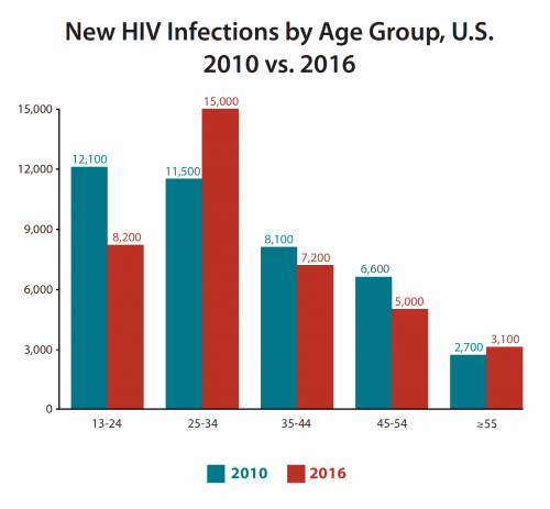 HIV incidence increased by almost one third among U.S. residents ages 25 to 34 years old (from 11,500 to 15,000) during the study period. Transmissions declined by about one third among those 13 to 24 years old (from 12,100 to 8,200), held essentially stable among those 35 to 44 years old (at about 7,000 cases), declined by about one fourth among those 45 to 54 years old (from 6,600 to 5,000) and remained essentially stable among those 55 years old and older (at about 3,000 cases).