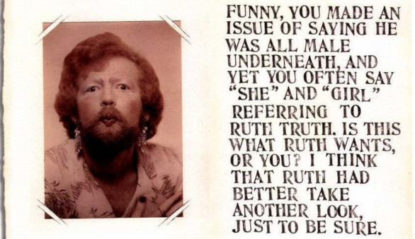 For our June issue, artist Barton Benes collaborates with his late friend Ruth Truth, a confirmed cross-dresser (see photo), and his late Aunt Evelyn, a confirmed crank (see text), to ask the old question “Male or female?” in a new way. Happy gay pride.