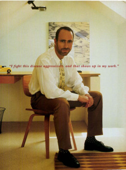 For many years, Los Angeles-based architect Frank Israel, 49, kept his condition under wraps for fear of losing both clients and friends. But with the appearance of KS lesions on his face and the subsequent (successful) chemotherapy treatments, he has confronted HIV and used it to fuel his creative work. Now he thinks is has made his work stronger. “You have to fight this disease in an aggressive way, and that shows up in my work. It is less formal, more twisted and distorted. It’s like the combination of drugs I take—nobody is sure what they all do together. It makes the work more dynamic,” he says.