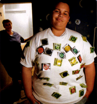 Lanessa Riobe, 16, of Kissimmee, Florida, in the Halloween costume that got her suspended from Osceola High School. Students helped themselves to 50 of her condoms by 8:30 a.m.—Riobe said the teens definitely needed them. Her proud HIV positive mom, Melissa Riobe, stands behind her.