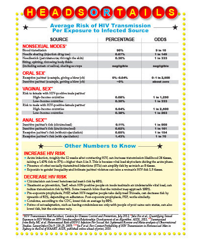 For starters, you have to understand that these probabilities of HIV transmission per single exposure are averages. They are general ballpark figures that do not reflect the many factors that can raise and lower risk.