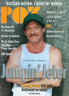 It’s a warm afternoon and we’re sitting outside, in the sight of the pool but well in the shade. To Jeter, it’s a much-needed rest before heading to Minneapolis to shoot The Naked Man with Michael Rappaport; he goes immediately to Poland after that to film Jakob the Liar with Robin Williams and next-up “It” boy Lieb Schrieber. To me, it’s a “Bactrim day”—a day for avoiding the sun. My lover, John, has just started Crixivan and is still adjusting. Jeter is immediately attentive, worried about us and quick to provide water and friendly reassurance. Something about our shared experience, our common battle against viruses and toxic medications, may account for the splendid synergy that arises as the afternoon wears on. Or maybe Jeter really is as nice as he seems.