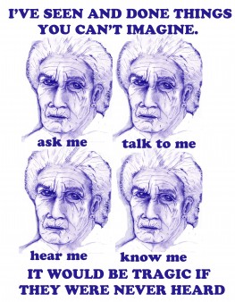 I did this image as part of an ongoing series about homeless women. I talked with women on the streets and drew their portraits, and put those together with quotes. I was particularly moved by what this woman said because it rang so true. We ignore older and marginalized women at a great loss. —Nancer Lemoins