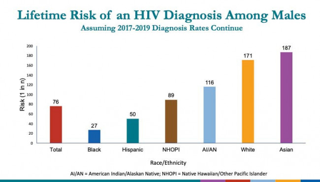 If the diagnosis rates from 2017 to 2019 remain the same going forward, the researchers project that 1 in 76 men could acquire HIV in their lifetime. But this varied greatly across groups. One in 27 Black men and 1 in 50 Latino men could be expected to acquire HIV, compared with 1 in 171 white men and 1 in 187 Asian men. This means Black men are about six times more likely than white men ever to be diagnosed with HIV.