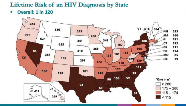 There were also some notable geographic disparities. States with the highest lifetime risk (shown in dark brown on the map above), matched fairly closely with those the CDC is targeting as part of its Ending the HIV Epidemic initiative. People in Washington, DC, have the highest lifetime risk, at 1 in 39, followed by Georgia (1 in 59), Florida (1 in 63 people) and Louisiana (1 in 69). In fact, Singh noted, 9 out of the 10 areas with the highest risk were in located the South. The states with the lowest lifetime risk of acquiring HIV were Wyoming (1 in 655), Idaho (1 in 624), Maine (1 in 584) and Montana (1 in 536).