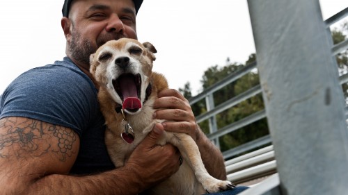 Photographer inkedKenny is known for his dark and moody images, but he was drawn to Dogs & Daddies because it allowed him to explore a softer point of view. “Throughout my career I have always wanted to do a photographic project that involved dogs and their owners,” inkedKenny says in the book’s press release. “This collaboration with Fred Says was the perfect vehicle to extend my aesthetic to a wider audience while simultaneously giving back to a community that is vitally important to me as an artist and activist.”