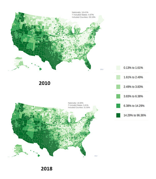 Responding to HIV among Latinx communities is integral to the success of this initiative. The Latinx community is growing across the United States and not just in coastal or border communities. From 2010 to 2018, more counties in the country’s interior had noticeable increases in their Latinx populations (see maps). More importantly, a significant proportion (31%) of the population in EHE jurisdictions is Latinx, well above the national average of 18%. In some jurisdictions it’s much higher, such as in Miami-Dade County at 69%.