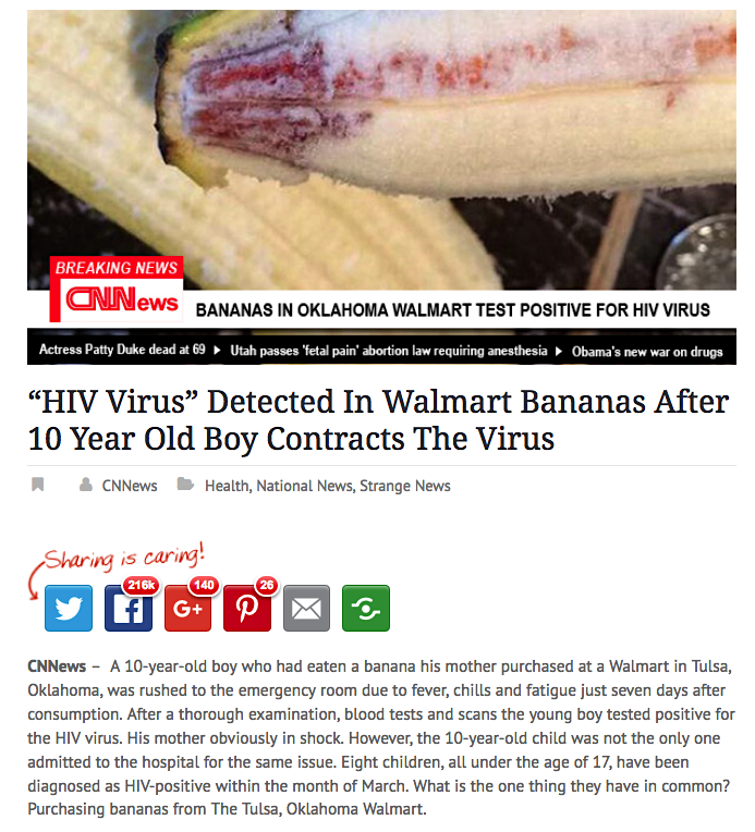 Here’s a fake news report that’s truly bananas: CNNews, a website designed to look like CNN, has been running a story with the headline “‘HIV Virus’ Detected In Walmart Bananas After 10 Year Old Boy Contracts The Virus.”