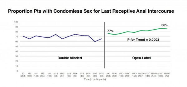 In the French IPERGAY study, there was a statistically significant rise in the rate of reported condomless sex between the placebo phase and open-label phase of the study. “Pts” = patients, or participants; “M” = month of the study.