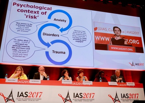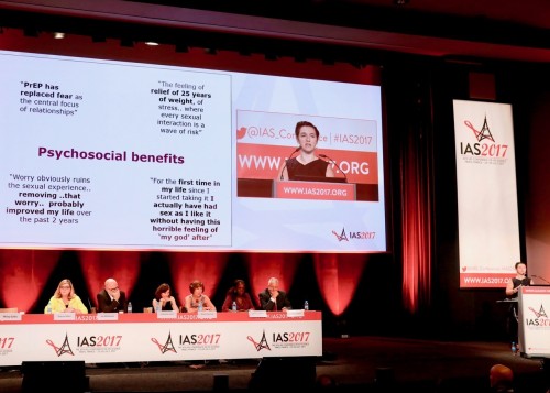 Mitzy Gafos, MsC, PhD, describes to attendees of IAS 2017 in Paris the implications of her work on the PROUD PrEP study of MSM in the U.K. Courtesy of Benjamin Ryan