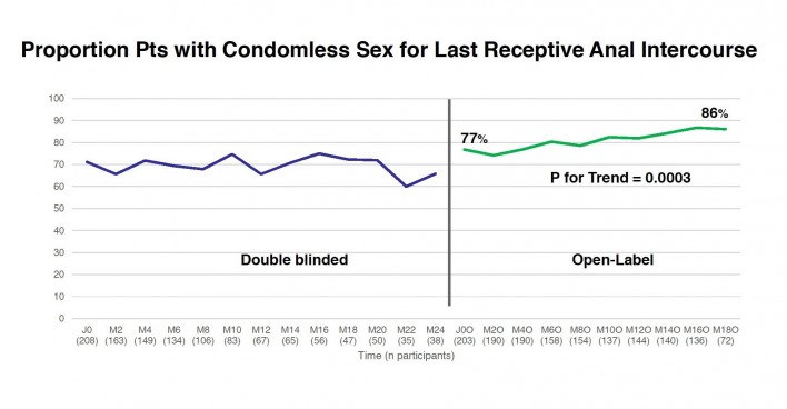 Participants did report a significant decrease between the two study phases in their rate of condom use for receptive anal intercourse (see the chart below). Through the 38 weeks of the placebo phase of the study, the proportion of men reporting condomless sex the last time they had intercourse wavered within the range of about 60 percent to 75 percent; the researchers did not identify a significant upward or downward trend during that phase of the study. The proportion reporting such behavior during the open-label phase increased steadily form 77 percent at the outset to 86 percent at week 72.