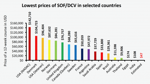 Sovaldi and Daklinza (daclatasvir) treatment for hep C range from a high of $142,710 in the United States to $104,723 in Denmark, $96,404 for treatment through Veterans Affairs in the United States, $50,059 in France, $29,361 in Brazil, $174 in Egypt and $108 in India. According to his team’s analysis, a generic version of the treatment could be produced for as little as $47.
