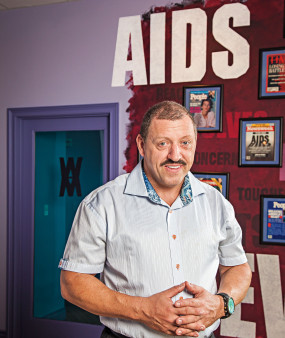 As director of operations at the World AIDS Museum and Educational Center in Wilton Manors, Florida, Ed Sparan gives one-hour docent tours of the facilities. He guides visitors through the main exhibit, which is a timeline of the virus—“People are surprised a panel goes back to 1908,” he notes—but the pièce de résistance is a sculpture titled “10 Year Ribbon,” in which an artist saved his Epzicom and Viramune bottles for a decade and transformed them into a red ribbon representing about $333,000 in HIV meds.