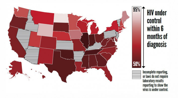 Among the approximately 845,000 people with diagnosed HIV, 318,000 (37%) had not achieved sustained viral suppression. But some groups had substantially higher proportions living with uncontrolled HIV, including people under 25 (43%), African Americans (43%) and men who inject drugs (48%). South Dakota had the highest proportion of people with unsuppressed virus (53%), while Iowa had the lowest (20%).