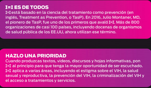 Cuando produzcas textos, videos, discursos y hojas informativas, pon I=I al principio para que tenga la mayor oportunidad de ser escuchado. I=I aplica a varias áreas, incluyendo el estigma sobre el VIH, la salud sexual y reproductiva, la prevención del VIH, la criminalización del VIH y el acceso a tratamientos y servicios.