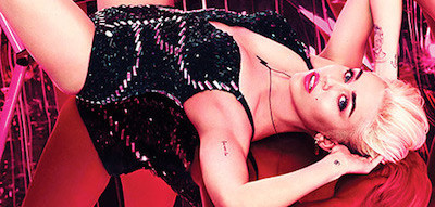 The campaign shows Miley in a sparkling black bodysuit. She’s lying on her back, on a mirrored floor, with her legs up against a mirrored wall. The result is a disco kaleidoscope of flesh, fuchsia and pinks.