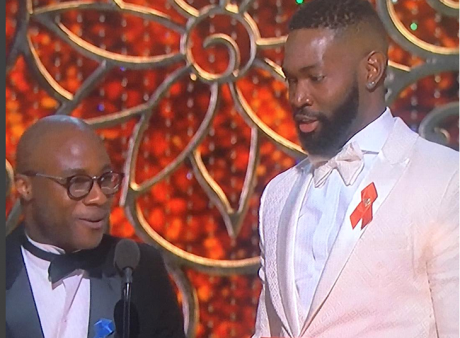 Another red ribbon made an appearance when Moonlight scribes Tarell Alvin McCraney and Barry Jenkins (who also directed the film) won the Academy Award for Best Adapted Screenplay. McCraney wore a red AIDS ribbon, while Jenkins wore a blue one that shows support for the legal group the American Civil Liberties Union (ACLU).