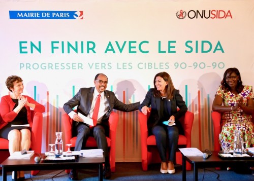 French AIDS ambassador Michèle Boccoz, executive director of UNAIDS Michel Sidibé, mayor of Paris Anne Hidalgo and Christine Kafando, a community health worker from Burkina Faso, speak at a press conference on the new 90-90-90 UNAIDS report.Benjamin Ryan