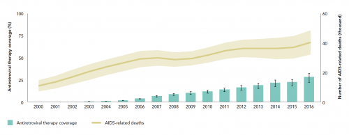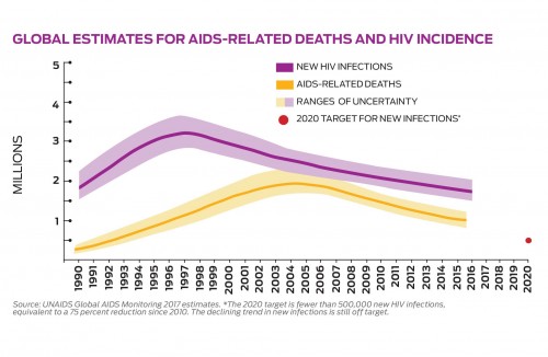 A primary driver of these global trends has been the full-court press against the devastating epidemic in eastern and southern Africa, home to just over half of the world’s HIV population. Having hit 76-79-83 on its way to the 90-90-90 target and an overall viral suppression rate of 50 percent, the 19-nation region saw its rate of annual new infections drop 29 percent between 2010 and 2016 while its AIDS-related death rate fell by 42 percent.