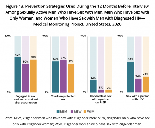 The survey included questions about sexual behavior and HIV prevention strategies. About 40% of men and 50% of women reported that they did not have vaginal or anal sex during the past year. An estimated 62% of sexually active gay and bisexual men had sex with sustained viral suppression, which prevents HIV transmission (undetectable equals untransmittable, or U=U). More than half (55%) used condoms, 54% had sex with another HIV-positive person and 22% had condomless sex with a partner on pre-exposure prophylaxis (PrEP).
