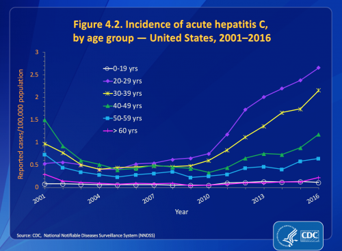 A recent CDC analysis charting the HCV epidemic’s expansion between 2005 and 2016 found that the annual diagnosis rate of acute cases of the virus—those diagnosed soon after infection—increased nearly seven-fold among 18- to 29-year-olds, from 0.4 cases to 2.7 cases per 100,000 people in this age bracket. At the same time, the acute-HCV diagnosis rate increased some five-and-a-half-fold among thirtysomethings, from 0.4 cases to 2.2 cases per 100,000 people.