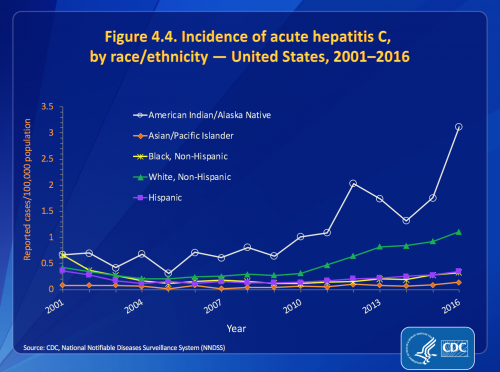 Among the four largest racial groups in the United States—whites, Latinos, Blacks and Asians and Pacific Islanders—such increases in HCV diagnosis have been most pronounced among whites, in particular those living in nonurban areas; Appalachian, Midwestern and New England states have been the most affected. That said, Native Americans and Alaska Natives have far and away the greatest acute-HCV diagnosis rate of any racial group, one that was about three times greater than that of whites in 2016.