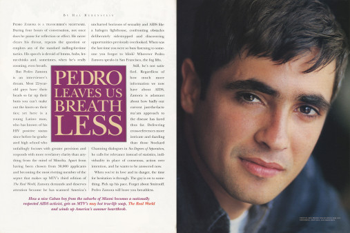 Titled “Pedro Leaves Us Breathless,” the cover story from the August/September 1994 issue of POZ—our third—was a Q&A with Pedro by renowned writer and pop culture columnist Hal Rubenstein. The interview explores how a Cuban-American boy from the suburbs of Miami became an AIDS activist. Below is an edited excerpt.