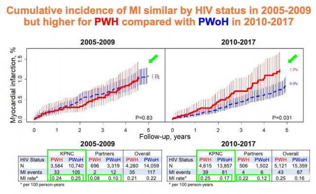 Silverberg and colleagues assessed changes over time in myocardial infarction rates among HIV-positive and HIV-negative members of two large health systems who had similar cardiovascular risk profiles. They compared two calendar eras: 2005 to 2009 and 2010 to 2017.