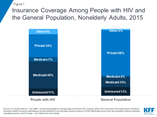 Graph of insurance coverage among people with HIV and the general population, nonelderly adults, in 2015.Kaiser Family Foundation