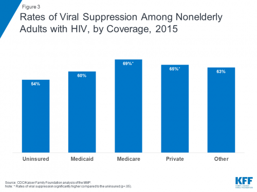 Graph of rates of viral suppression among nonelderly adults with HIV, by coverage, in 2015.Kaiser Family Foundation