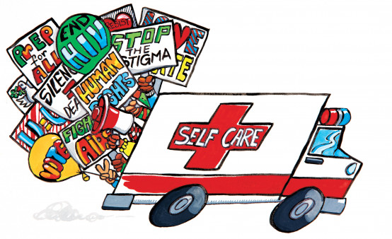 This environment can have an effect on our HIV-negative allies as well, a condition known as vicarious trauma. “You cannot witness a story and not be affected by it,” Campbell cautions. “For instance, before I worked with domestic violence survivors, I never thought twice about people walking too closely behind me. So if I am working as an advocate for long-term survivors and hear those stories or I deliver test results in an HIV clinic, it impacts how I think and react to the world.”