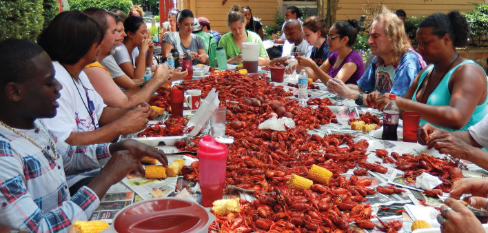 Enjoying a crawfish communal meal. Courtesy of Project Lazarua