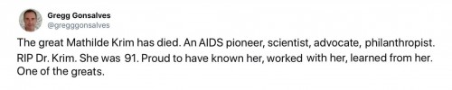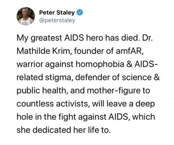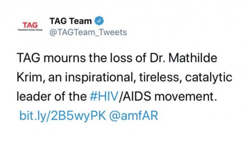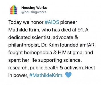On January 15, 2018, the world lost a beloved pioneer in the fight against HIV/AIDS. Mathilde Krim, PhD, was a cancer researcher in New York City when she first learned about AIDS in 1981 via her friend Joseph Sonnabend, MD, and in short order, her research pivoted to the study of the illness. As the epidemic escalated among gay men and drug users, society and the government aimed stigma their way. It was at this point that Krim the scientist became an AIDS activist, promoting needle exchanges and condoms and campaigning against homophobic laws. In 1983, she, Sonnabend and others cofounded the AIDS Medical Foundation, which in 1985 merged with the National AIDS Research Foundation to become amfAR, The Foundation for AIDS Research. To date, amfAR has raised $517 million, rendering it the nation’s foremost private supporter of AIDS research, prevention, treatment and advocacy and cementing the fierce and charismatic Krim’s legacy as a superstar fundraiser and an ally for the history books. Rest in power, Dr. Krim.