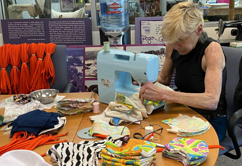 Gert McMullin sews masks out of extra fabric from the AIDS Memorial QuiltCourtesy of BACS/Mike Smith