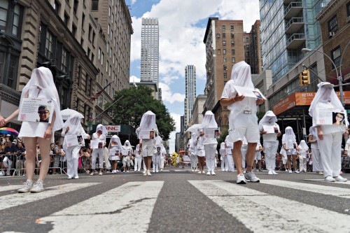 Between that first meeting and Sunday, June 26, the day of the Pride March, we had grown to over 1,000 marchers, chief among them the 49 Human Beings representing those lost at Pulse. They were veiled and dressed formally in all white. Some carried white lace parasols or other props and were led by a Human Being holding a giant disco ball aloft on a pole.