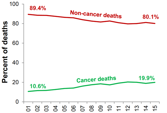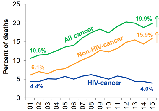 Between 2001 and 2015, the proportion of deaths from HIV-related cancers among the HIV population remained essentially stable, beginning at 4.4 percent and ending at 4 percent of all deaths. During this period, the proportions of deaths related to all cancers rose from 10.6 percent to 19.9 percent while the non-HIV-related cancer proportion rose from 6.1 percent to 15.9 percent. In other words, the rising proportion of deaths related to cancer was driven by a marked increase in the proportion of deaths from non-HIV-related cancer.