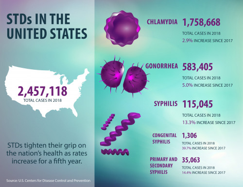 The Centers for Disease Control and Prevention (CDC) reports that new diagnoses of sexually transmitted infections (STIs) have continued their steady upward trajectory in the United States, with combined cases of chlamydia, gonorrhea and syphilis hitting a record high of 2.5 million cases in 2018.