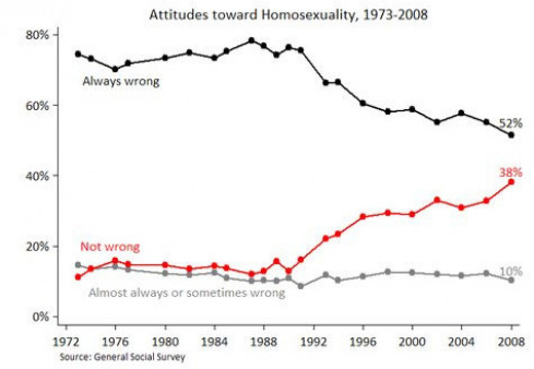 "That was thetransformative, traumatizing effect of AIDS on both gay and straight America. It came in the early 1980s, but the deaths only reached their stunning peaks in the early 1990s - which is when the polling shifts. "Remember: most of these deaths were of young men. If you think that the Vietnam war took around 60,000 young American lives randomly over a decade or more, then imagine the psychic and social impact of 300,000 young Americans dying in a few years. Imagine a Vietnam Memorial five times the size. The victims were from every state and city and town and village. They were part of millions and millions of families. Suddenly, gay men were visible in ways we had never been before. And our humanity - revealed by the awful, terrifying, gruesome deaths of those in the first years of the plague - ripped off the veneer of stereotype anddemonization and made us seem as human as we are. More, actually: part of our families. “I think that horrifying period made the difference. It also galvanized gay men and lesbians into fighting more passionately than ever - because our very lives were at stake.”
