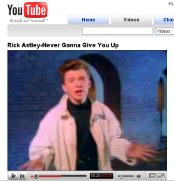 What is Rickrolling? It’s telling somebody that a link leads to something they may find of interest, but instead they click and find themselves watching the video to Rick Astley’s late-80’s hit song, “Never Gonna Give You Up”.
