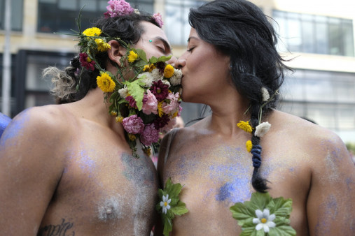 Interspersed with all of the flowers is the reality of the challenges in this moment of flowering for some, and the “condition of being pressed upon” that can close up petals but keep growth flowing within. Liliana Maresca’s ETA represents a transition piece, an alchemical sculpture that solidifies the reaching roots of a branch into bronze hold, fixed. In works by Michael Colgan, Shan Kelley, and Eric Tenorio, windows act as portals, connecting interior and outside spaces—and isolation and physical connection— with feelings of trepidation, love, and self-reflection, respectively. Chloe Dzubilo’s Untitled (I Ask Myself) shows the artist’s body wrapped in hearts, and the caption reveals the incredible struggle to move, to even get out of bed, through daily pain. In Sunil Gupta’s Shroud/Pleasuredrome, the artist lays in bed, shrouded, juxtaposed with the memory or the motivation of the sauna space. Out in the world, the subjects of Carlos Sanchez’s work—the everyday people of Venezuela in 2017—are denied medicines due to scarcity, reminding us of the treatment imbalances of an inequitable world.