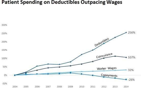 In The Wall Street Journal, Drew Altman, the president and CEO of Kaiser Family Foundation, analyzed the growing trends in patient spending on deductibles (a specified amount of money that the consumer must pay out-of-pocket first before an insurer pays for services). Their analysis showed a 256% increase in deductible payments from 2004 to 2014 for insured people through larger employers, while wages increased by only 32% during the same period. In 2014, deductible accounted for 47% of all cost-sharing, up from 24% in 2004. Indeed, consumer polls indicated that deductibles are their top health-cost concern.