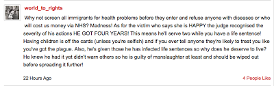 Certainly, readers’ comments suggest the tabloids did their job of dehumanising Mr Mabanda - many calling for his death, castration or, at the very least, immediate deportation to what they hope will be a certain and painful death in the absence of HIV treatment in his native Zimbabwe. Anti-immigration (and anti-African) sentiment is also widely expressed. The comment below is illustrative of all of the above, and yet also alludes to the difficulties of disclosure due to HIV stigma. (Of course, having children if you are HIV-positive is neither “off the cards” nor “selfish” - it is possible to conceive and give birth with minimal risk to a sexual partner or infant and many people with HIV can, and do, have children with the full support of their doctors, partners and families.)