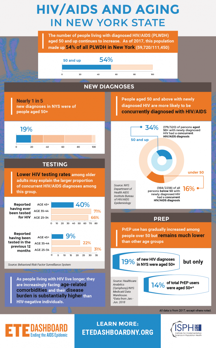 View the ETE Dashboard’s infographic on HIV/AIDS and Aging in New York State to learn some basics about this population in New York. For more information about HIV testing, PrEP use, and care continuum outcomes and trends among older adults who are living with HIV/AIDS and those newly diagnosed, explore our data visualizations and filter results using the age group menu option.