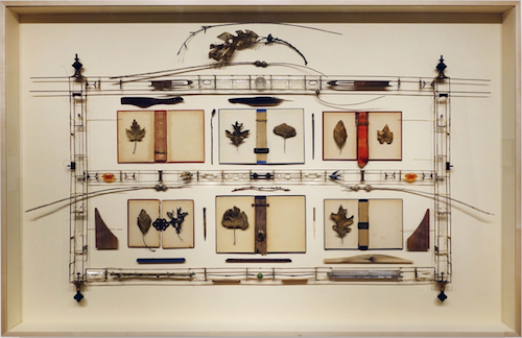 Rhein’s photographs, leaves and video are shown here with a fourth group of work: framed, intricate assemblages that refer to diagrams, early technical or scientific illustrations, and vitrines or retratos for the display of sacred objects. These have the feel of psychic souvenirs, objects built to contain and preserve memory, and perhaps to lift elements of memory into another realm by situating them, as Joseph Cornell did, within a space of their own. The title of one of these works, “The Order” (2006-2015), echoes the title of the exhibit as a whole, “Ordained.”