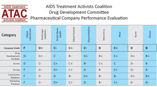 The AIDS Treatment Activists Coalition (ATAC), of which I’m a member, issued report cards on the nine major pharmaceutical companies with HIV drugs on the market, and most aren’t exactly graduating with honors (the average grade was C-minus).