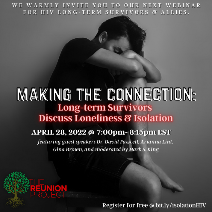 The Reunion Project, a national network of long-term HIV/AIDS survivors, is producing a webinar, “Making the Connection: Long-Term Survivors Discuss Loneliness and Isolation,” set for 7pm ET on Thursday, April 28th. You can register for free right here.
