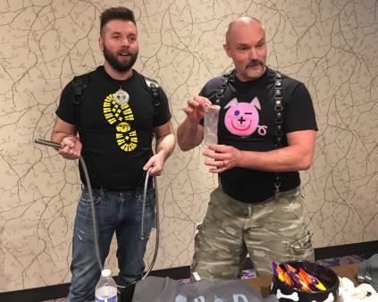 Watt also hosted another workshop with Mr. Liberty Leather 2018 Will Baker titled “I Like Clean Butts (I Cannot Lie!),” which focused on healthy ass play. Watt and Baker shared tips and tricks on how to douche like a pro, and attendees were encouraged to share what works for them. Watt and Baker also explained how to use the internal condom (also known as the female condom) when you don’t have time to clean out. The workshop leaders were surprised to learn that only five of the 30 men attending the session were familiar with this type of condom, which is also referred to as a “catcher’s mitt” or “butt bag.”