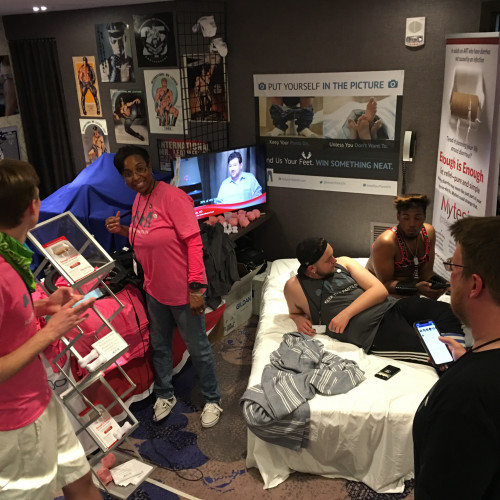 In addition to the numerous workshops and presentations, CLAW featured an expanded VendorMart. HIV-related vendors included the pharmaceutical company Gilead, which hosted a booth and answered questions about PrEP (pre-exposure prophylaxis) and HIV treatment medications. The Napo Pharmaceuticals booth highlighted its award-winning campaign “Keep Your Pants On…Unless You Don’t Want To” and raised awareness of HIV-related diarrhea. For a small donation, the Mr Friendly booth offered safer sex conversation starters such as T-shirts, dog tags, pins and various leather accessories. The grassroots organization aims to reduce HIV-related stigma and to encourage HIV testing. With a positive and negative sign on a smiling face, the Mr Friendly logo is a great way to show support for people of any status.